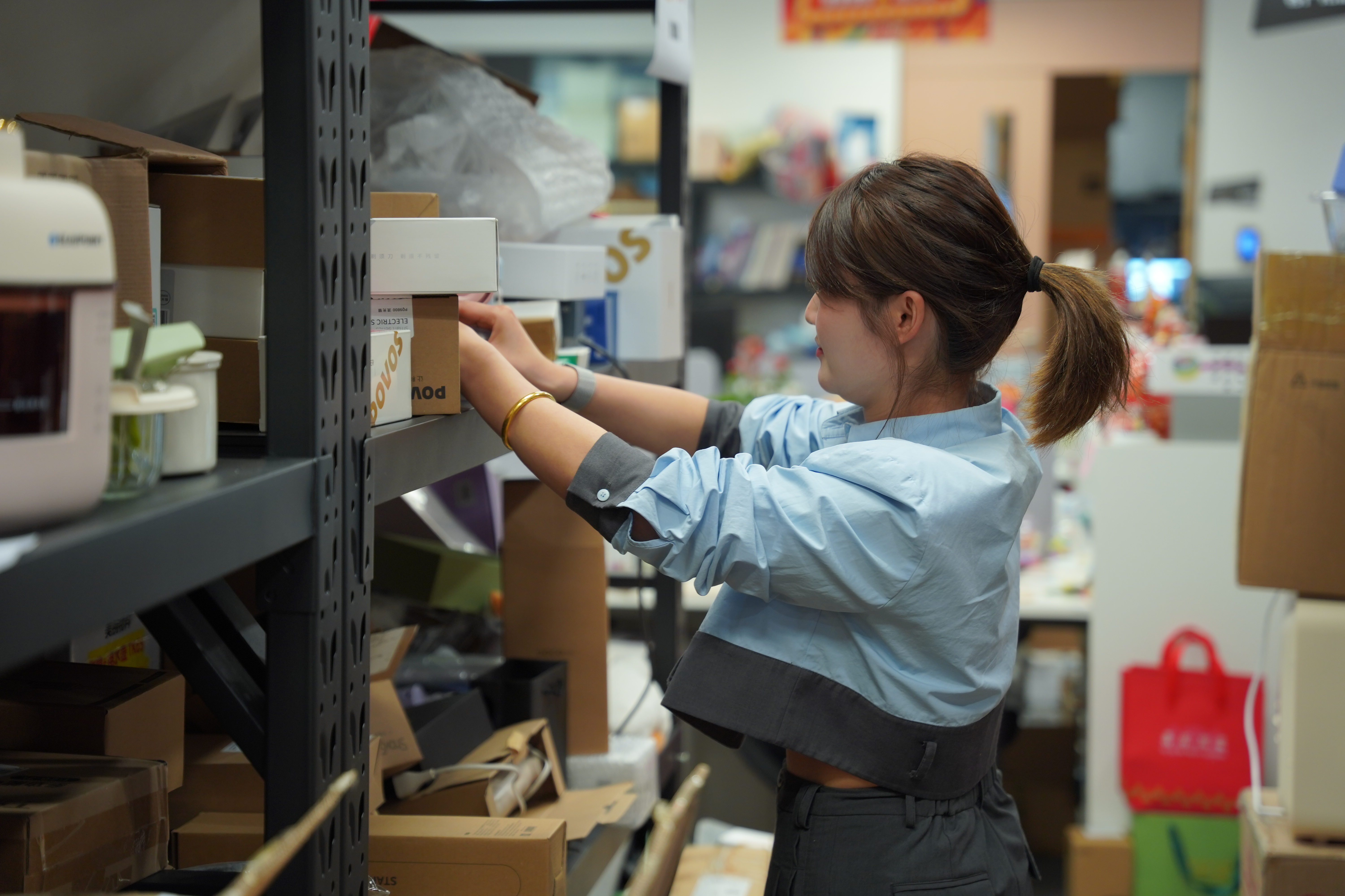 美腕直播间工作人员在直播前清点家电样品。受访者供图